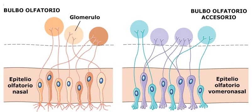 - El bulbo olfatorio cuenta con muchos glomérulos, los cuales son el lugar donde ocurre la sinapsis entre los axones de los nervios que vienen desde las células olfatorias y las dendritas de las células mitrales y de las células en penacho.