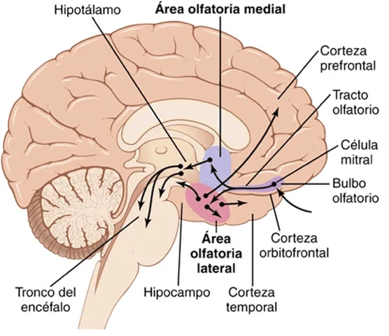 El nervio olfatorio entra al sistema nervioso central justo en la unión del mesencéfalo con el cerebro, mismo lugar donde se divida en dos vías